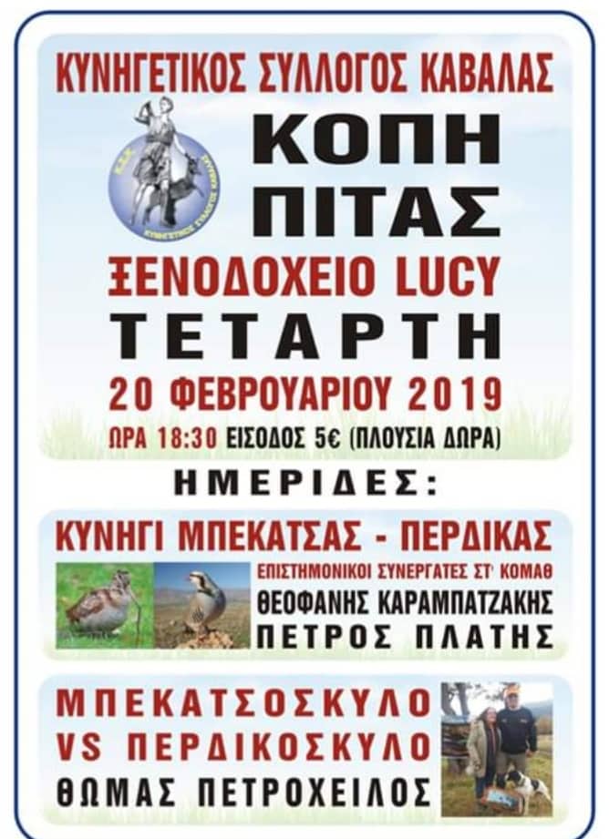 Την Τετάρτη 20 Φεβρουαρίου, στις 18:30, κόβει την πίτα του στο ξενοδοχείο LUCY ο Κυνηγετικός Σύλλογος Καβάλας.