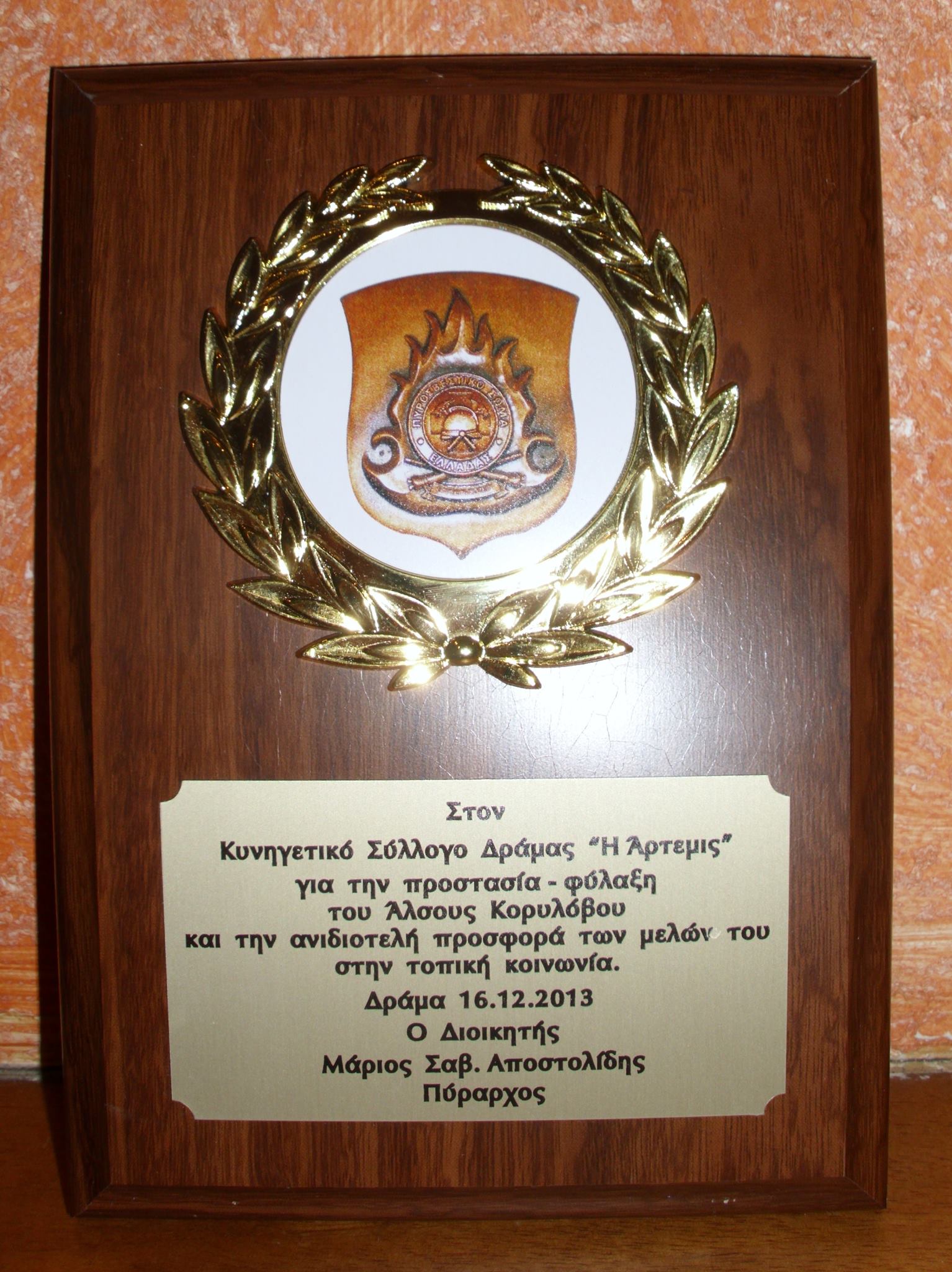 Τη Δευτέρα 16 Δεκεμβρίου 2013 πραγματοποιήθηκε στο χώρο της Πυροσβεστικής Υπηρεσίας Δράμας ο Αρχιερατικός Εσπερινός για τον εορτασμό των προστατών του Πυροσβεστικού Σώματος χοροστατούντος του Σεβασμιωτάτου Μητροπολίτη Δράμας κ. κ. Παύλου. Κατά τη διάρκεια της εκδήλωσης απονεμήθηκε τιμητική πλακέτα στον Κυνηγετικό Σύλλογο Δράμας «Η Άρτεμις» για την προσφορά του στη φύλαξη και προστασία του Άλσους Κορυλόβου.