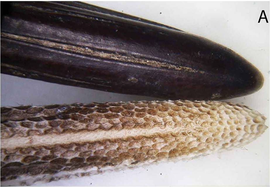 Εικόνα 1. Το ράμφος της μπεκάτσας με και χωρίς το δέρμα. Στις μικρές κοιλότητες είναι οι νευρικές απολήξεις.