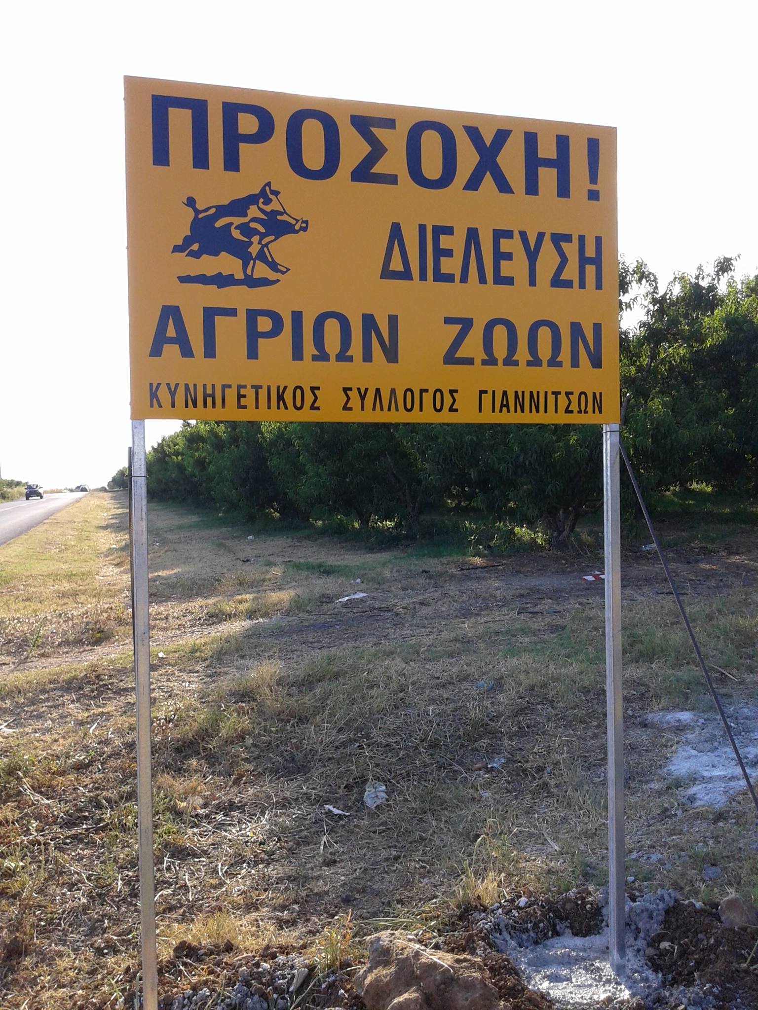 Ο κυνηγετικός σύλλογος Γιαννιτσών , Ο Φασιανός , στα πλαίσια φιλοθηραματικής δράσης και ενημέρωσης του κοινού προς αποφυγή τροχαίων ατυχημάτων τοποθέτησε επί της παλαιάς Επαρχιακής Οδού Γιαννιτσών – Αριδαίας πινακίδες σήμανσης διέλευσης αγρίων ζώων μετά από δύο τροχαία ατυχήματα με πρόσκρουση ιχε με αγριόχοιρο , εντός του τελευταίου 15ημέρου.