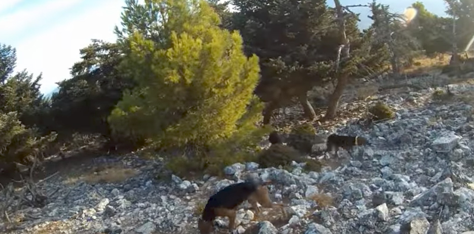 Ένα πολύ ωραίο στιγμιότυπο από ένα πετυχημένο ορεινό λαγοκυνήγι. Τα σκυλιά σηκώνουν τον λαγό,ο συνάδελφος βρίσκεται στην κατάλληλη θέση και με την τρίτη τουφεκιά ανταμείβει την εργασία τους.