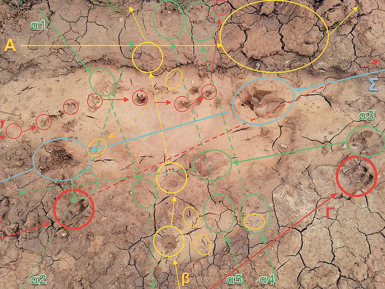 Πέντε διαφορετικά ίχνη αλεπούδων, (α1 μέχρι α5) προς όλες τις κατευθύνσεις με πιο φρέσκο ίχνος, αργά το πρωί, το α3.