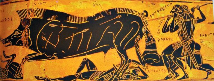 Η εμβόλιμη αφήγηση του Νέστορα στην Ιλιάδα με επίκεντρο το περίφημο κυνήγι του ΚΑΛΥΔΩΝΙΟΥ κάπρου, αναπτύσσεται σε περίπου 70 στίχους. Στο Κυνήγι συμμετείχαν όλοι οι σελέμπριτι της Χώρας.