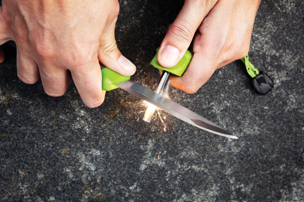 Εννοείται ότι κυκλοφορεί μόνο σε 4 έντονα χρώματα (πορτοκαλί, γαλάζιο, πράσινο ανοιχτό, κόκκινο) για να είναι ευδιάκριτο και ασφαλές για τα παιδιά. Εκείνο που μας εντυπωσίασε στη χρήση του είναι οι γωνίες στη ράχη της λάμας στο ύψος της ακμής, που έχουν κατασκευαστεί με τέτοιο τρόπο ώστε να υπερπαράγουν σπινθήρες που τους στέλνουν κατευθείαν στο… προσάναμμα, κάτι διόλου τυχαίο αφού η εταιρεία μαχαιριών κατασκευάζει λάμες πάνω από 120 χρόνια!