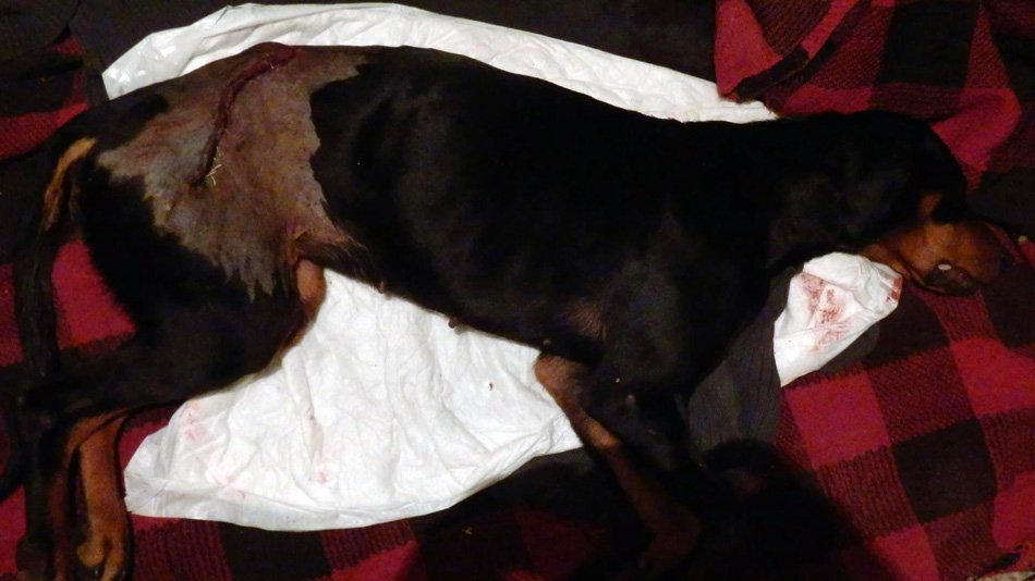 Καθαρίζουμε όσο το δυνατόν καλύτερα μπορούμε τα σπλάχνα με καθαρό νερό και στη συνέχεια τα περιδένουμε με το σελοφάν. Να σημειώσουμε εδώ, πως τα σπλάχνα δεν πρέπει να τοποθετηθούν ξανά μέσα στη κοιλιά γιατί δεν έχει προηγηθεί λεπτομερής καθαρισμός αυτών και αυξάνεται ο κίνδυνος μόλυνσης από υπολείμματα που τυχόν παρέμειναν. Κατόπιν, απαιτείται η γρήγορη μεταφορά στο αυτοκίνητο με κάποιο αυτοσχέδιο φορείο που θα φτιάξουμε εκείνη τη στιγμή, είτε με (μπουφάν, μπλούζα σε συνδυασμό με δυο κλαδιά) και μετέπειτα η διακόμισή του στο κτηνιατρείο. Από εκεί και ύστερα, απαραίτητη προϋπόθεση να σταθεί σύμμαχός μας και η τύχη.
