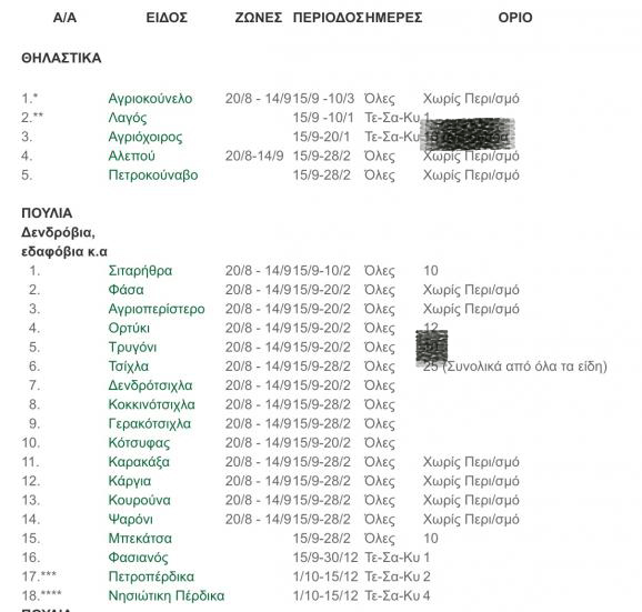 | 14. | Ψαρόνι | 20/8 – 14/9 | 15/9-28/2 | Όλες | Χωρίς Περι/σμό |