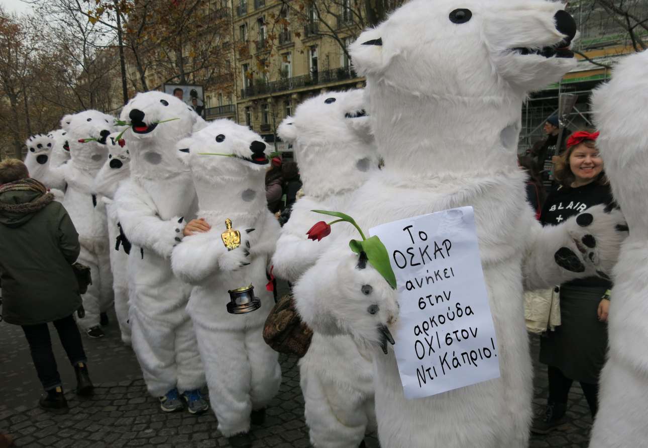 Στη φωτό ακτιβιστές ντυμένοι με στολές αρκούδας και κρατώντας Οσκαρ ζητούν αποκατάσταση της συμπρωταγωνίστριας τυ Λεονάρντο Ντι Κάπριο