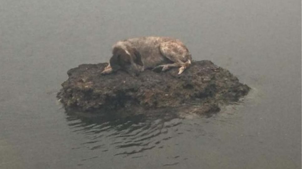 Στην εικόνα, βλέπουμε έναν καφέ-λευκό σκύλο, που έχει μαυρίσει από την κάπνα, να ξεκουράζεται και να προσπαθεί να συνέλθει από το σοκ πάνω σε ένα μικρό βραχάκι, στη θάλασσα, στο Μάτι Αττικής.