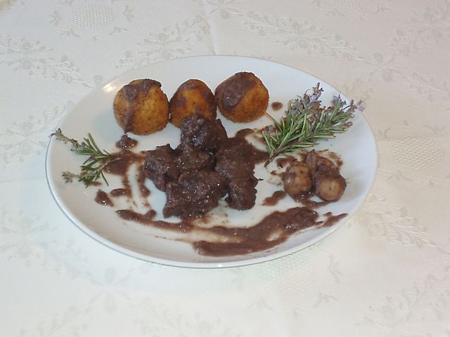 • Βάζουμε αλάτι και πιπέρι, πασπαλίζουμε με το αλεύρι και προσθέτουμε τα υλικά της μαρινάδας. Το μαγειρεύουμε σε χαμηλή φωτιά για μία ώρα.