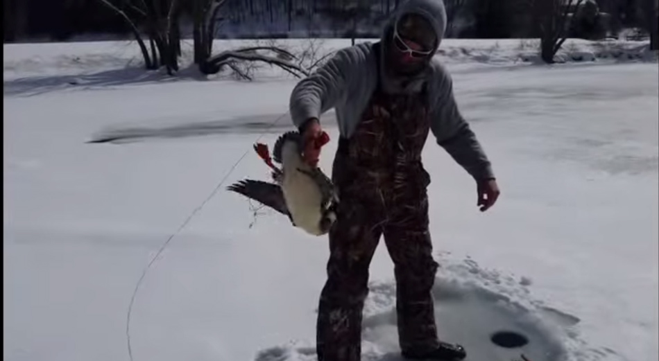Οι δύο ψαράδες πλησίασαν την τρύπα που είχαν ανοίξει στον πάγο, για να ψαρέψουν, όταν η σημαδούρα που είχαν βάλει τους έδειχνε ότι κάτι είχε πιαστεί στο αγκίστρι τους. Τότε ο Νικόλας άρχισε να τραβά προς την επιφάνεια την πετονιά για να βγάλει τη λεία του, όμως έμεινε άφωνος όταν είδε πως στο αγκίστρι είχε πιαστεί μία… πάπια!