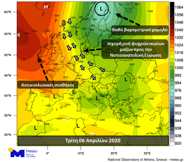 Ψυχρές αέριες μάζες από την Βορειοδυτική Ευρώπη κινούνται προς τη Βαλκανική Χερσόνησο και τη χώρα μας με αποτέλεσμα την πτώση της θερμοκρασίας από το βράδυ της Τετάρτης 07/04. Η νέα ψυχρή εισβολή οφείλεται στο συνδυασμό ενός βαθέως χαμηλού στην περιοχή της Βόρειας Σκανδιναβίας και των έντονα αντικυκλωνικών συνθηκών δυτικά της Ιρλανδίας. Ο εν λόγω συνδυασμός έχει ως αποτέλεσμά την ενισχυμένη ροή ψυχρών αερίων μαζών προς τη Νοτιοανατολική Ευρώπη. Στο σχετικό χάρτη φαίνονται οι θέσεις του χαμηλού και του αντικυκλώνα καθώς και η ισχυρή ροή των αερίων μαζών στην περιοχή μεταξύ των δύο βαρομετρικών συστημάτων.
