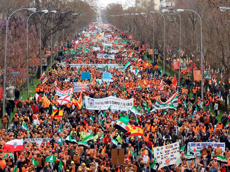 Το ραντεβού που συγκλήθηκε από Asaja, COAG, UPA, Βασιλική Ισπανική Κυνηγετική Ομοσπονδία (RFEC), Εθνικό Γραφείο Κυνηγιού (ONC), Ένωση Εκτροφέων του Μαχητικού Ταύρου (UCTL), Εθνική Ομοσπονδία Αρδευτικών Κοινοτήτων της Ισπανίας (Fenacore) , Αγροδιατροφικοί Συνεταιρισμοί και Αγροτική Συμμαχία, προκάλεσε την κατάρρευση της πόλης τις ώρες πριν από τη διαδήλωση, στην οποία χρειάστηκε να βρεθούν 1.600 λεωφορεία, όπου περισσότερα από 45 τρακτέρ, άλογα, πρόβατα, σκυλιά rehala, γεράκια, κυνηγοί, αγρότες, κτηνοτρόφοι και άνθρωποι από τον αγροτικό κόσμο γεμίσαν το Paseo de la Castellana σε μια διαμαρτυρία που ξεκίνησε από την Plaza del Emperador Carlos V μέχρι το Fuente de San Juan de la Cruz, μπροστά από το Υπουργείο Οικολογικής Μετάβασης.