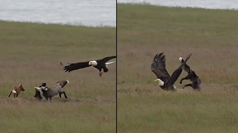 Αετός εντόπισε μια αλεπού που είχε πιάσει έναν λαγό. Πέταξε αμέσως στο έδαφος για να αρπάξει τη λεία της. Ωστόσο, εκείνη την προστάτευσε με το ίδιο της το σώμα και έτσι η επίθεση του αετού απέτυχε.