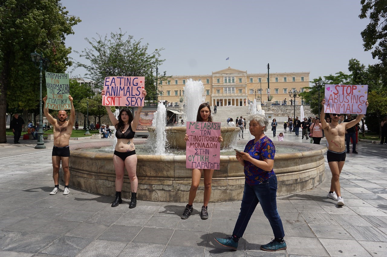 Βίγκαν ακτιβιστές πραγματοποίησαν διαμαρτυρία την Κυριακή 14 Μαΐου υπέρ των δικαιωμάτων των ζώων, μένοντας ημίγυμνοι στην Πλατεία Συντάγματος.