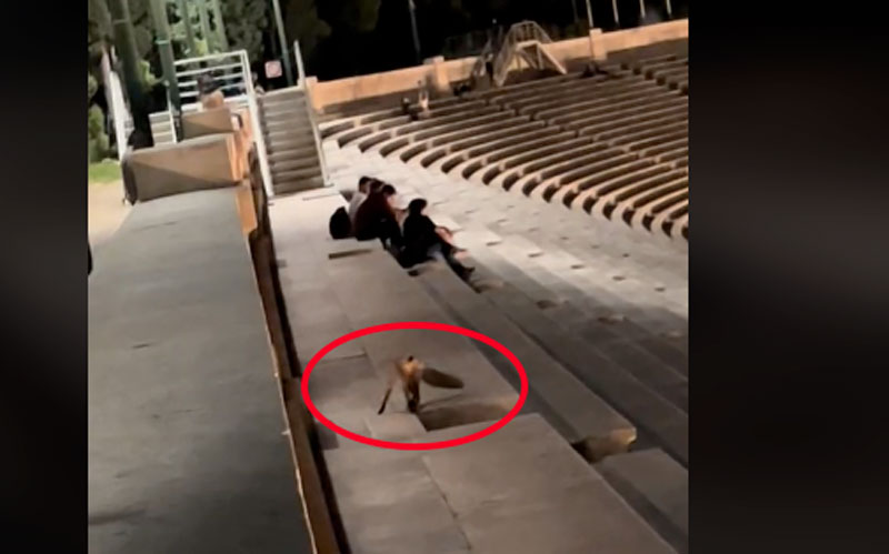 Στο βίντεο φαίνεται η αλεπού να «κόβει» βόλτες στα σκαλιά ενώ παραδίπλα κάθεται μια παρέα.