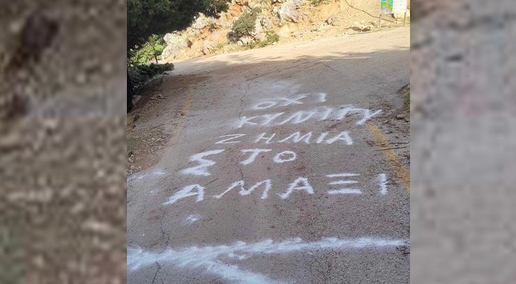Όπως μας ανέφερε χαρακτηριστικά ο αναγνώστης, “κάποιοι έγραψαν στον δρόμο να μην κυνηγήσουν οι κυνηγοί γιατί θα κάνουν ζημιά στα αυτοκίνητα. Το Σαββατοκύριακο είναι η μέρα κυνηγιού εκεί”. Ξεκάθαρη απειλή δηλαδή…