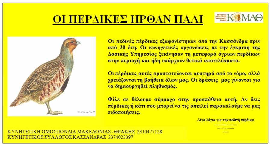 2) Την πεδινή πέρδικα σε περιοχές με χειμερινά σιτηρά. Η πεδινή πέρδικα έχει τεράστια κυνολογική αξία και είναι κρίμα να μένει περιορισμένη σε λίγες περιοχές της βόρειας Ελλάδας. Η περίπτωση της Κασσάνδρας Χαλκιδικής συνιστά ένα επιτυχές παράδειγμα ζώγρησης και επανεγκατάστασης πεδινής πέρδικας.