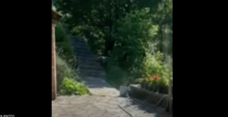 Στο βίντεο η αρκούδα εμφανίζεται δίπλα από τα σκαλοπάτια που φαίνονται στο βάθος και κάτω από το δέντρο.