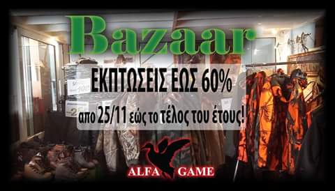 Με εκπτώσεις που φτάνουν έως και 60% άρχισε το BAZAAR στο κατάστημα κυνηγετικών ειδών ALFA GAME στη Δραπετσώνα. Ενδεικτικά σας αναφέρουμε :