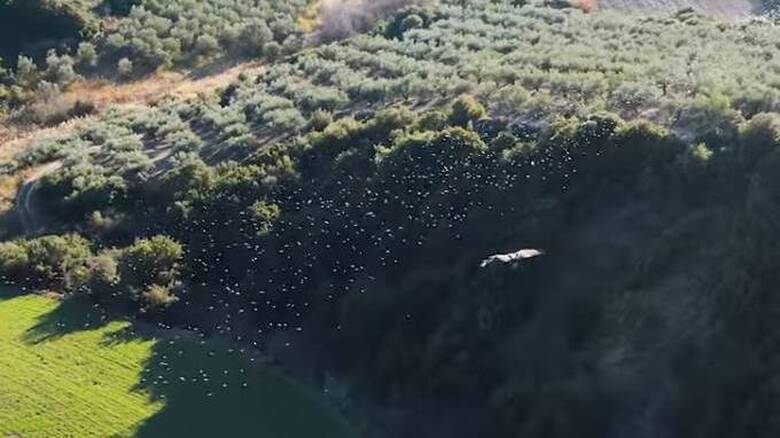 Eντυπωσιακές εικόνες κατάγραφε ο φακός, από την επίθεση γερακιού σε σμήνος πουλιών, στην Ελάτεια.