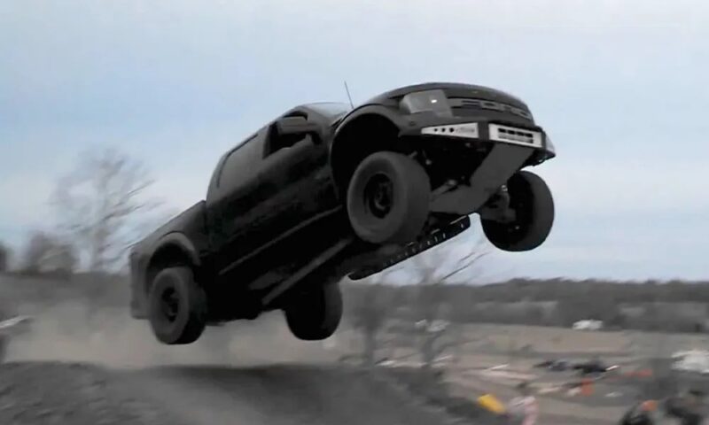 Σε ένα από τα περάσματα, ο οδηγός αποφάσισε να πιέσει λίγο παραπάνω. Και σήκωσε στον αέρα το Raptor με ταχύτητα κοντά στα 100 χλμ/ώρα. Η προσγείωση όμως ήταν μάλλον λάθος, καθώς το τεράστιο pick-up έσκασε στο έδαφος με τους τέσσερις τροχούς ταυτόχρονα.
