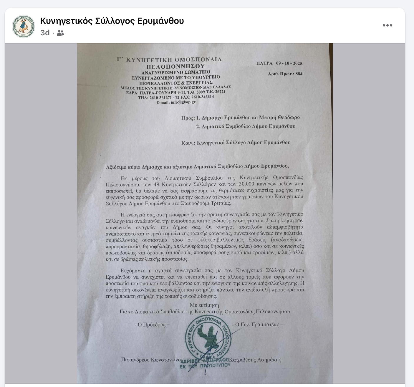 Η Γ’ Κυνηγετική Ομοσπονδία Πελοποννήσου, εκπροσωπώντας 49 Κυνηγετικούς Συλλόγους και περισσότερους από 30.000 κυνηγούς-μέλη, απέστειλε επιστολή ευχαριστίας προς τον Δήμο Ερυμάνθου και τον Δήμαρχο εκφράζοντας την αναγνώριση και την εκτίμησή της για την ευγενική παραχώρηση χώρου στέγασης των γραφείων του Κυνηγετικού Συλλόγου Δήμου Ερυμάνθου στο Σταυροδρόμι Τριταίας.