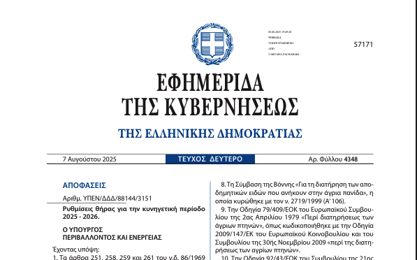 Δημοσιεύτηκε στην εφημερίδα της Κυβέρνησης η ρυθμιστική απόφαση θήρας για την κυνηγετική περίοδο 2025-2026.