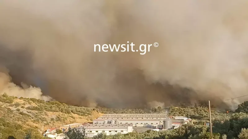 Πύρινο μέτωπο 15 χιλιομέτρων έχει κρύψει τον ουρανό στα Δερβενοχώρια, όπου μεγάλη φωτιά μαίνεται ανεξέλεγκτη από χθες Δευτέρα (18.7.2023).