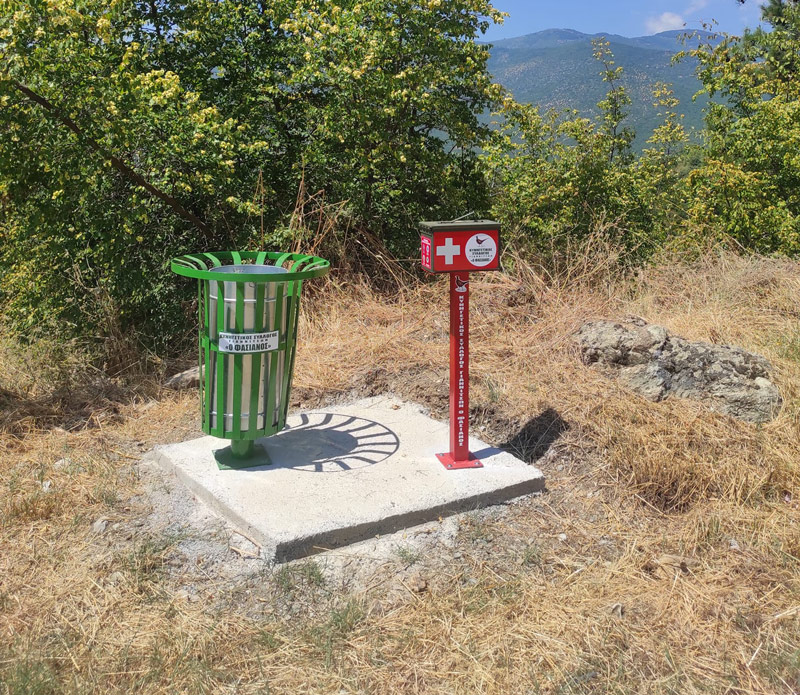 Στη συνέχεια τοποθετήθηκαν δύο κάδοι απορριμμάτων, καθώς και τρία κουτιά πρώτων βοηθειών, για περιπτώσεις ανάγκης των επισκεπτών του βουνού.