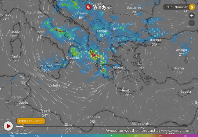 Ανεμοι: Από νότιες διευθύνσεις 4 με 6 μποφόρ που από το μεσημέρι και από τα βόρεια θα στραφούν σε βορειοδυτικούς με την ίδια ένταση.