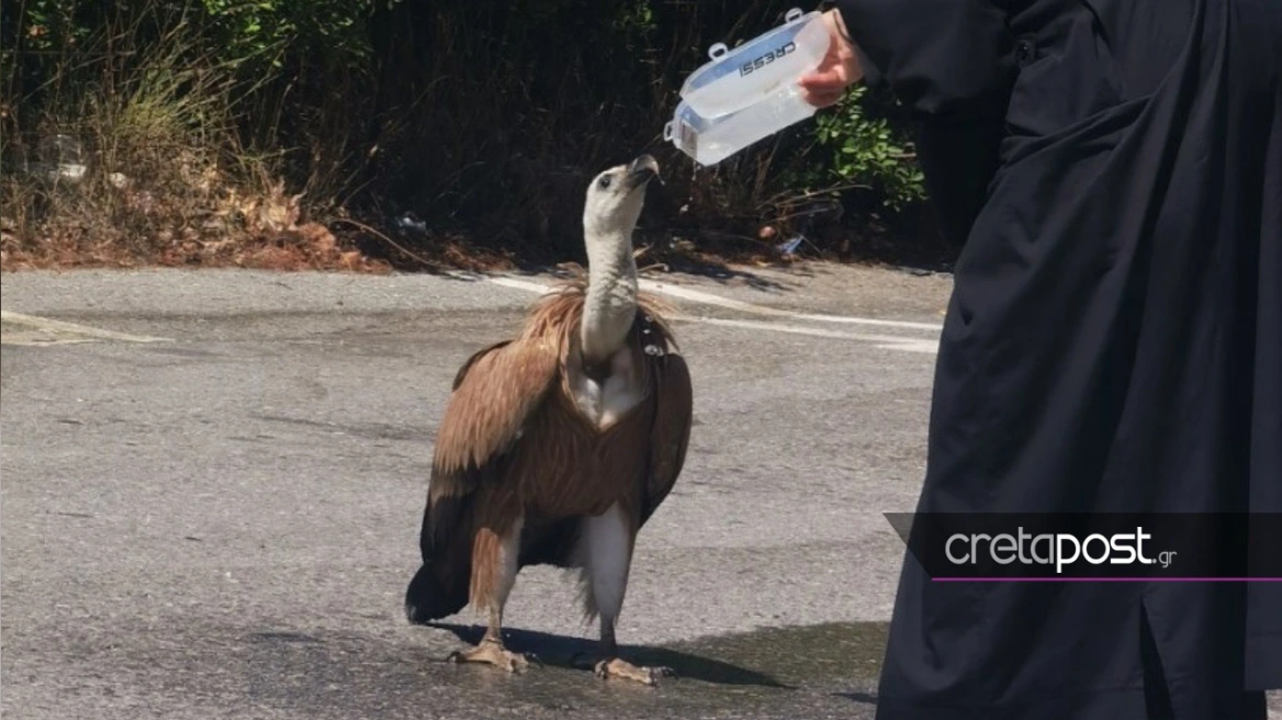 Ο ιερέας από τον Ιερό Ναό Αγίου Γεωργίου στο Σεληνάρι δίνει λίγο νερό στο εξαντλημένο από τη ζέστη όρνιο που προσγειώθηκε στη μέση της εθνικής οδού Ηρακλείου Αγίου Νικολάου.