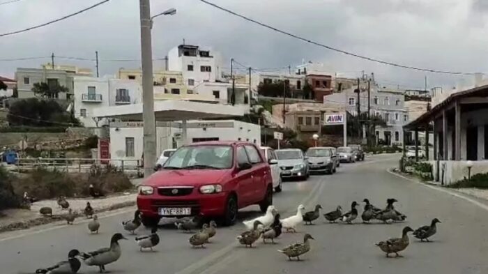 Ένα χαριτωμένο περιστατικό κατέγραψε ερασιτεχνική κάμερα στην περιοχή Λαζαρέτα της Σύρου. Για λίγη ώρα, προκλήθηκε συμφόρηση όταν πάπιες βγήκαν «βόλτα» στον δρόμο διακόπτωντας για λίγα λεπτά την κυλκοφορία των οχημάτων. Οι οδηγοί του νησιού έδωσαν φυσικά προτεραιότητα στους… πεζούς που αναζητούσαν τροφή.