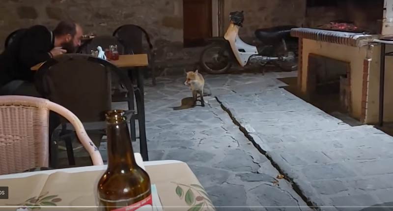 Όπως θα δείτε και στο βίντεο του lamiareport.gr η αλεπού δεν περιμένει έξω στην πλατεία, αλλά μπαίνει μέσα στο καφενείο και φυσικά «ανταμείβεται» για την παρέα της.