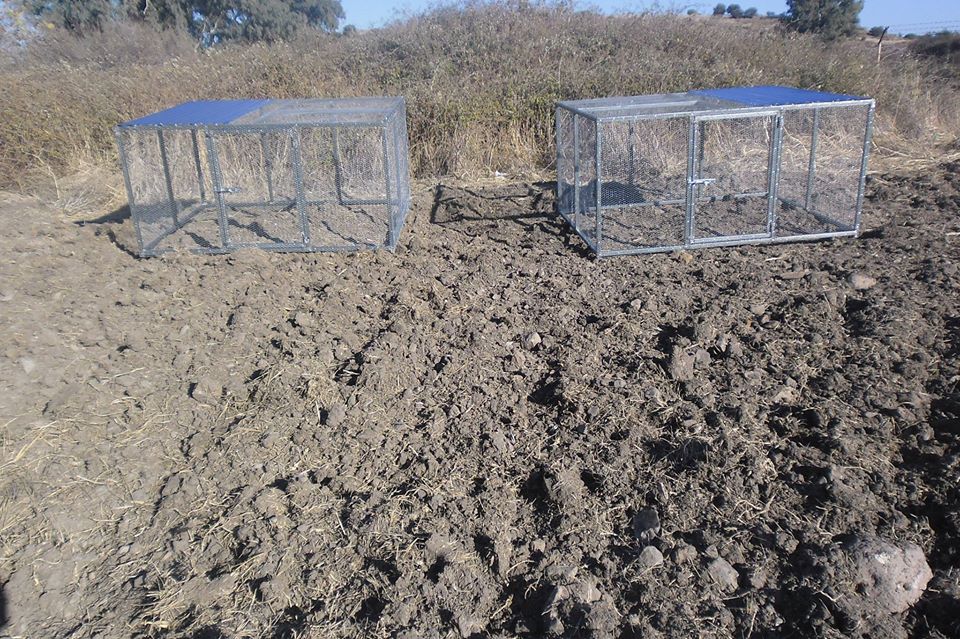 Μικροί μεταφερόμενοι κλωβοί προσαρμογής τοποθετημένοι σε περιοχή που έχουμε πραγματοποιήσει σπορά με σιτάρι και κριθάρι, για το πρόγραμμα σταδιακών απελευθερώσεων περδίκων που θα ακολουθήσουμε φέτος.