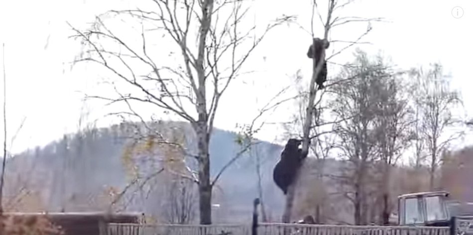 Αυτό που βλέπει δεν περιγράφεται. Ένας άνδρας σε κατάσταση πανικού να έχει σκαρφαλώσει επάνω σε ένα δέντρο και μια αρκούδα να τον έχει ακολουθήσει, να έχει σκαρφαλώσει και εκείνη, να βρίσκεται λίγα μέτρα χαμηλότερα του στο δέντρο και να τον απειλεί.