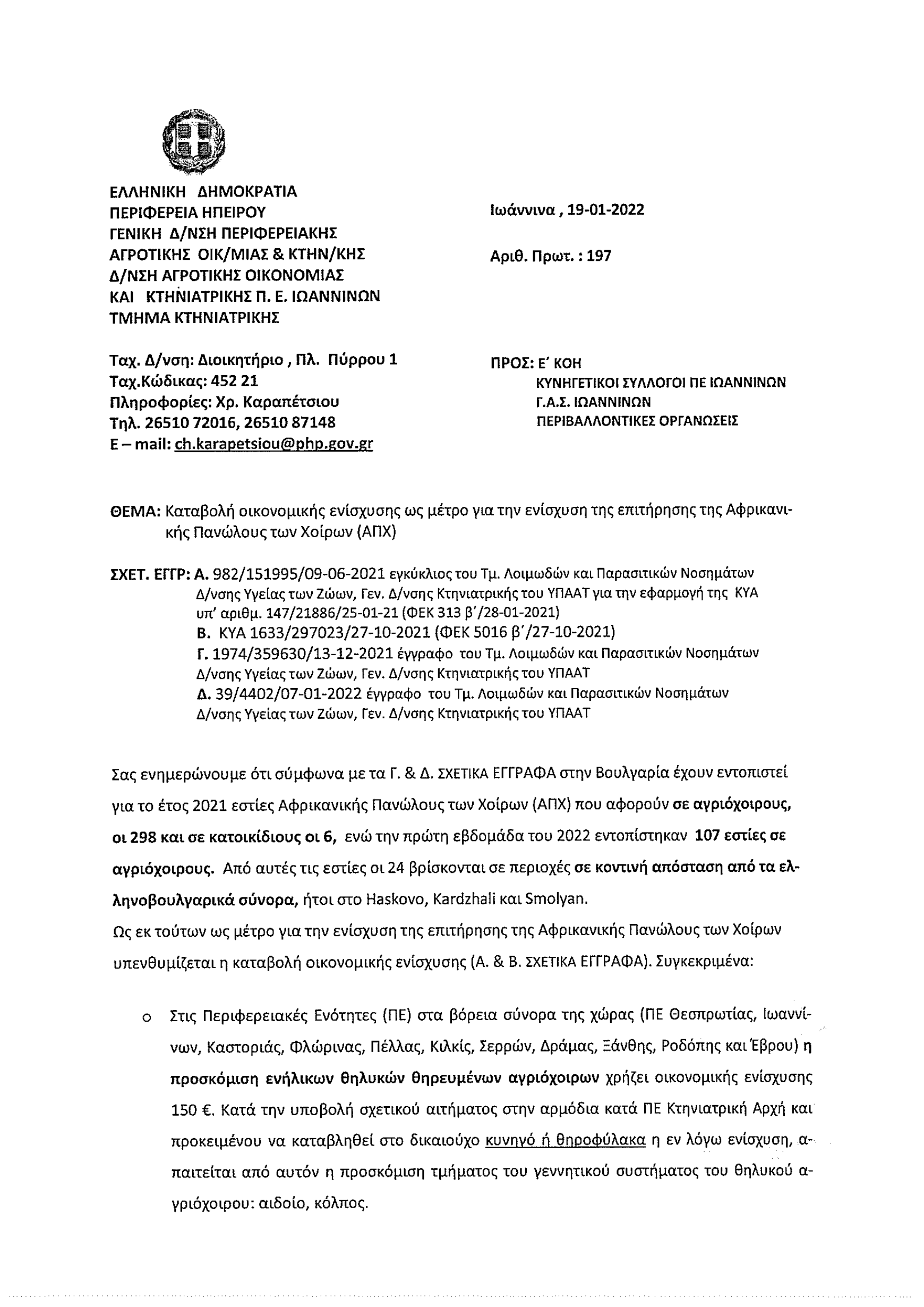Στα πλαίσια της ενεργητικής πρόληψης και επιτήρησης της Αφρικανικής πανώλης των χοίρων η Περιφέρεια Ηπείρου, αποφάσισε την καταβολή οικονομικής ενίσχυσης στους κυνηγούς για τα δείγματα αγριόχοιρων που θα προσκομίσουν στην κτηνιατρική υπηρεσία της Π.Ε. Ιωαννίνων.