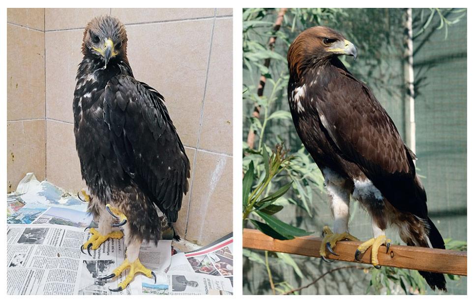 Αριστερά, ο χρυσαετός όπως εντοπίσθηκε το καλοκαίρι σε φωλιά στον Λαγκαδά Θεσσαλονίκης, με «εφεδρικά» πόδια και στα δύο άκρα, και δεξιά, μετά τη χειρουργική αφαίρεση των επιπλέον άκρων, στην Κτηνιατρική Σχολή του ΑΠΘ.