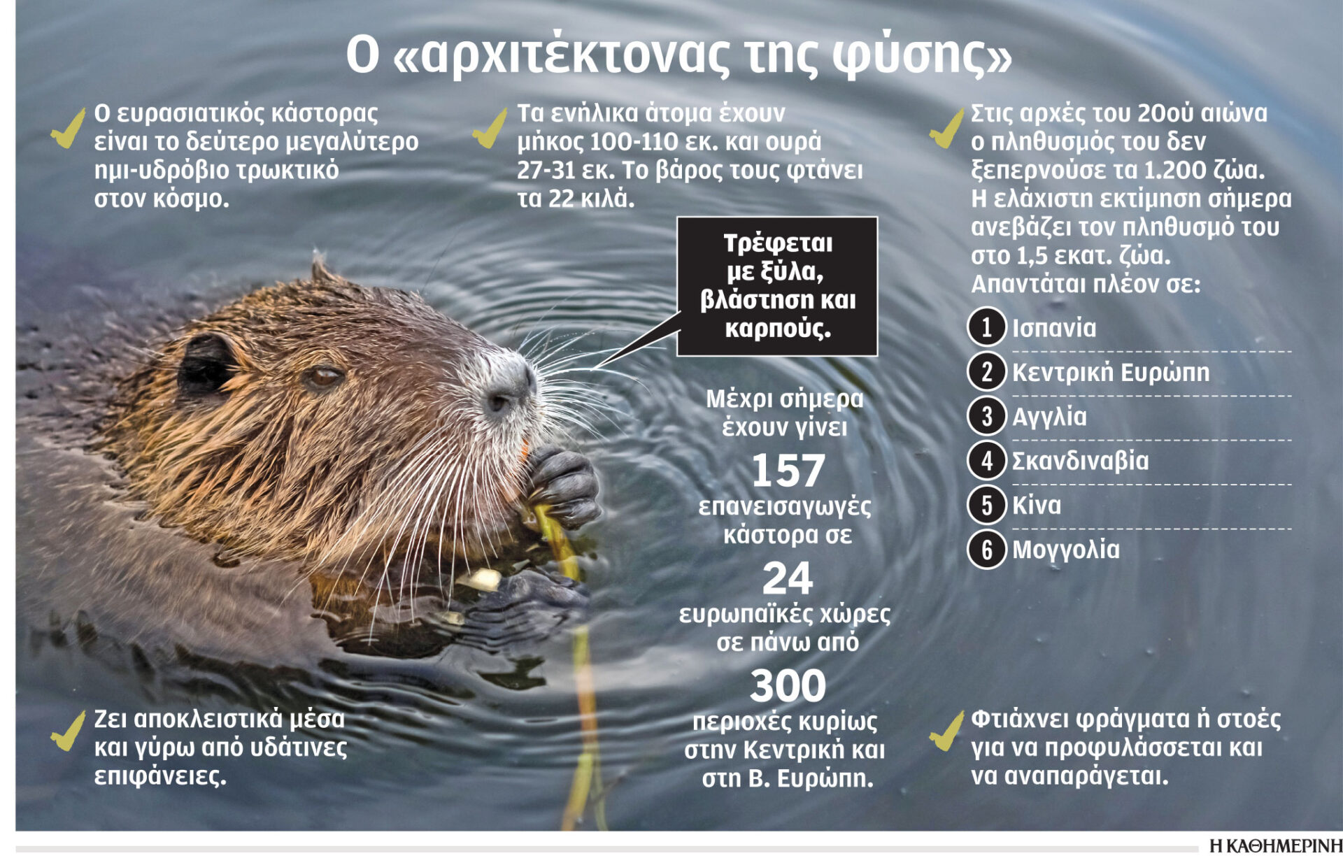Στο πλαίσιο του προγράμματος, πριν από λίγες ημέρες βρέθηκε στη χώρα μας κλιμάκιο κορυφαίων ειδικών για τη μελέτη του κάστορα από την Αγγλία και τη Γερμανία, προκειμένου να ελέγξει τα οικοσυστήματα που έχουν προκριθεί για την επανεισαγωγή του είδους: την περιοχή του εθνικού πάρκου της Ροδόπης (ποταμός Νέστος) και τη Δυτική Μακεδονία (ποταμός Αλιάκμονα και λίμνες Πρεσπών). Εκτιμάται ότι η χώρα μας θα ωφεληθεί ποικιλοτρόπως από την επανεμφάνιση του κάστορα στις λίμνες και τα ποτάμια της. «Με τα φραγματάκια που κατασκευάζει δημιουργεί πολύ σημαντικά λιμναία οικοσυστήματα, ενώ συντηρεί μεγάλο αριθμό ειδών και βοηθάει να επανέλθουν τα οικοσυστήματα στην πρότερη κατάστασή τους. Εχουμε υπολογίσει ότι τουλάχιστον 150 άλλα είδη, από αμφίβια και νυχτερίδες μέχρι ψάρια γλυκού νερού, θα ωφεληθούν στην Ελλάδα από τον κάστορα», λέει ο κ. Κομηνός. «Επιπλέον, σε μια περιόδο ξηρασίας λόγω κλιματικής αλλαγής, τα μικρά φράγματα βοηθούν τον υδροφόρο ορίζοντα να απορροφάει νερό». Είναι χαρακτηριστικό, σύμφωνα με τον κ. Κομηνό, ότι στην Αμερική επανεισάγεται ο κάστορας σε διάφορες περιοχές ώστε να βοηθήσει στην προστασία από τις πυρκαγιές. «Εχει βρεθεί ότι οι μόνες περιοχές που μένουν ανέπαφες σχεδόν από τις μεγαπυρκαγιές είναι εκεί που έχει κάνει δουλειά ο “μηχανικός της φύσης”, δημιουργώντας μικροκλίμα και υγρασία». Ο κάστορας είναι ωφέλιμος ακόμα και για το φιλτράρισμα των νερών. «Στις περιοχές όπου υπάρχουν ρυπογόνες ανθρώπινες δραστηριότητες, βοηθάει τα νερά που φτάνουν στις καλλιέργειες να είναι πιο καθαρά».