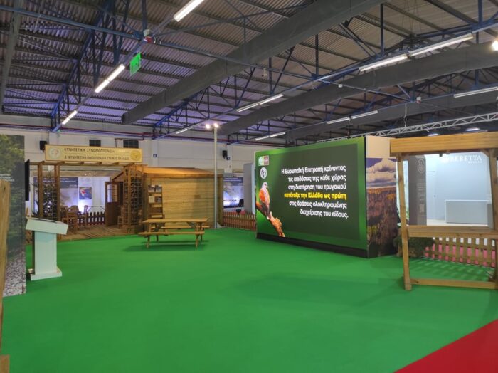 Το πρώτο περίπτερο στην έκθεση είναι αυτό της ΚΣΕ και της Δ’ΚΟΣΕ. Στο περίπτερο δεσπόζει μια οθόνη η οποία ενημερώνει τους κυνηγούς για το τι έγινε τη χρονιά που πέρασε με το τρυγόνι και την ηλεκτρονική εφαρμογή κάρπωσης.