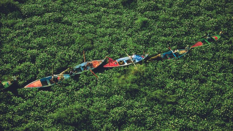 Πολλά χωροκατακτητικά είδη έχουν καταλάβει και τα υδάτινα οικοσυστήματα. Στην Καραϊβική, τα δηλητηριώδη λεοντόψαρα μειώνουν τον αριθμό των ιθαγενών ψαριών. Στις Μεγάλες Λίμνες, τα μύδια-ζέβρα φράζουν τους σωλήνες πόσιμου νερού και των σταθμών παραγωγής ενέργειας. Ωστόσο ένα από τα πιο καταστροφικά είδη είναι ένα λεπτεπίλεπτο λουλούδι. Πρόκειται για τον υάκινθο του νερού, ένα φυτό που επιπλέει και αναπτύσσεται τόσο γρήγορα που μπορεί να καλύψει ολόκληρες λίμνες, εμποδίζοντας την κυκλοφορία των σκαφών και το ψάρεμα. Σε ορισμένες περιπτώσεις, το φυτό αυτό απορροφά τόσο πολύ νερό που στεγνώνει τις λίμνες. Η έκθεση θεωρεί τον υάκινθο, ο οποίος εμφανίζεται παντού από την Αφρική έως την Αυστραλία, το πιο διαδεδομένο χωροκατακτητικό φυτό στη Γη.