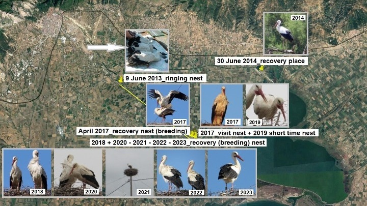«Παρατηρήθηκε και δακτυλιώθηκε αρχικά σε ομάδα των πελαργών που δεν αναπαράγονται ακόμα. Γύρισε λίγα χρόνια αργότερα και από το 2017 “ επιμένει” πάντα στο ίδιο χωριό και ας τον είχαν διώξει στο παρελθόν από άλλες φωλιές οι άλλοι πελαργοί. Από το 2018 (με εξαίρεση το 2019) έρχεται σταθερά στην ίδια φωλιά. Γνωρίζουμε από τις παρατηρήσεις στο ζευγάρωμα ότι είναι θηλυκό, έχει κάνει ήδη πολλά μικρά που και αυτά έχουν δακτυλιώθει και από κάποια είχαμε επανευρέσεις. Τα παιδιά της πελαργίνας αυτής είχαν γίνει γονείς και τα μικρά των παιδιών τους έχουν δακτυλιωθεί και αυτά».