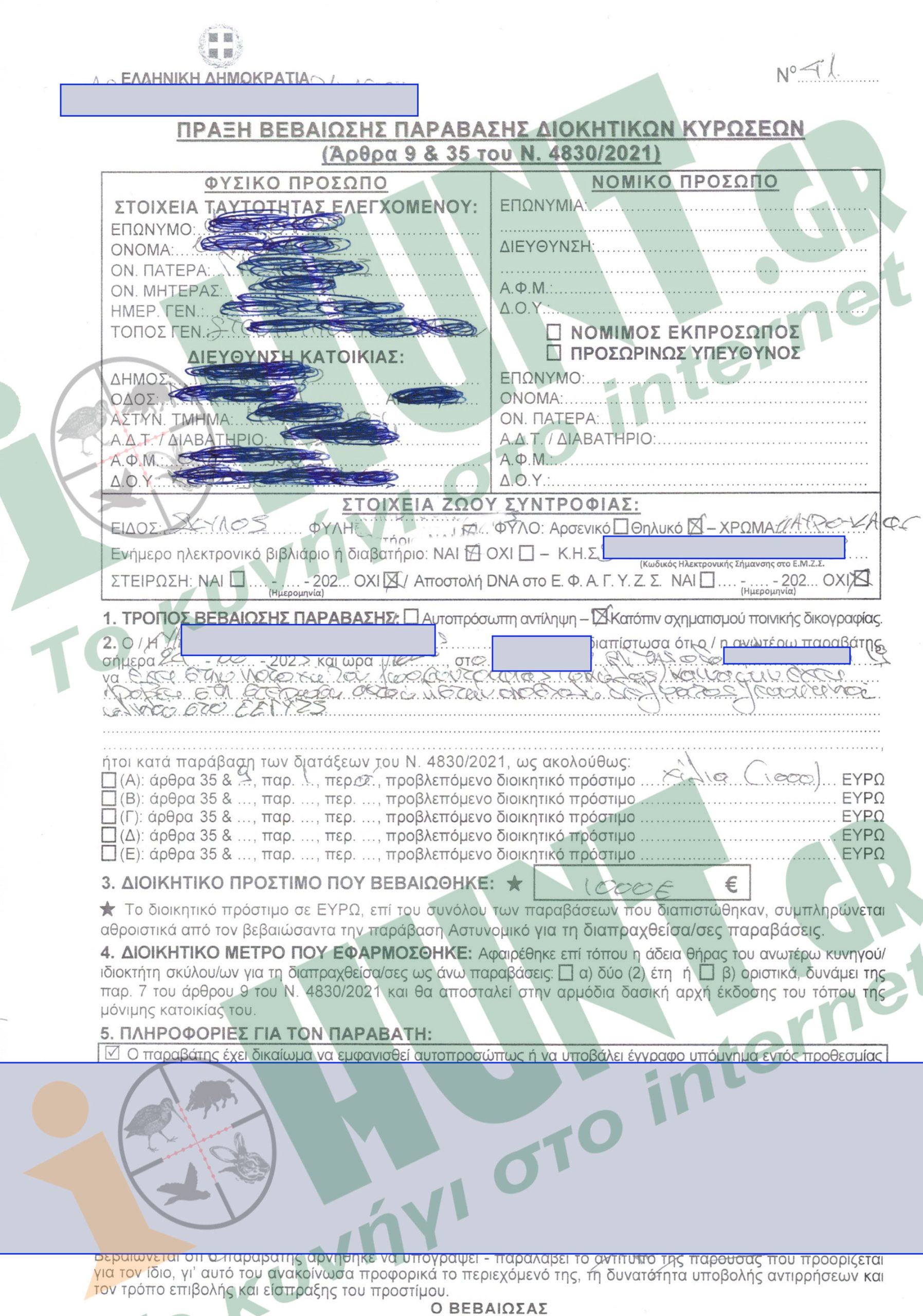• Αφαίρεση άδειας κυνηγιού για 2 έτη σε κυνηγό του οποίου ο σκύλος δεν έχει σημανθεί, καταχωρηθεί και στειρωθεί ή δεν έχει αποσταλεί δείγμα DNA