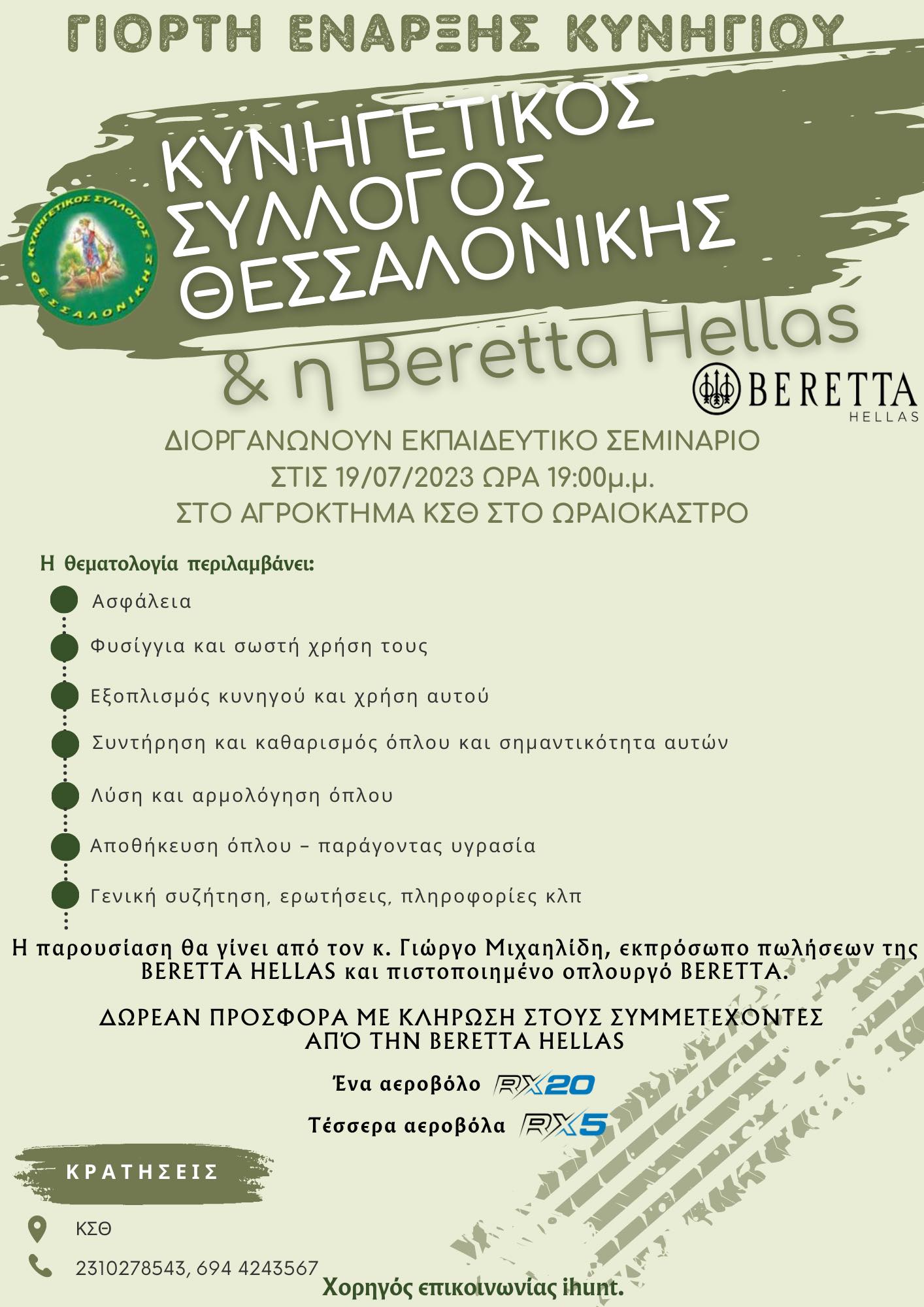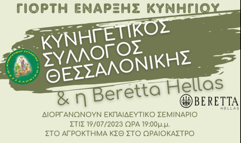 Την Τετάρτη 19 Ιουλίου στις 19:00 θα πραγματοποιηθεί η μεγάλη γιορτή για την έναρξη της κυνηγετικής περιόδου που διοργανώνει ο Κ.Σ Θεσσαλονίκης και η Beretta Hellas.