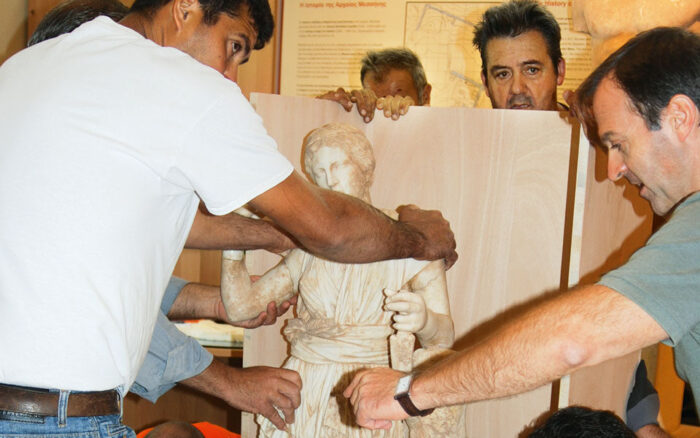 Οκτώ άνδρες μέσα και τέσσερις ακόμη έξω αγωνίζονται να πείσουνε «ευγενικά» εμένα την Αρτέμιδα Λαφρία (εικ. 1), τη λεπτοκαμωμένη καλλονή θεά του κυνηγιού, να εγκαταλείψω το βάθρο μου και το αγαπημένο μου μουσείο, κτισμένο απ’ τον αείμνηστο ιπτάμενο Ορλάνδο στον θερμό Νότο της μεσογειακής πατρίδας, εκεί που μ’ έφερε στο φως και μ’ έστησαν ο Πέτρος και η Ανδρομάχη. Με σέρνουν απαλά με προσοχή, ομολογώ (εικ. 2), για να με κλείσουνε ερμητικά σε ξύλινο σεντούκι που ετοιμάστηκε στα μέτρα μου για να μεταφερθώ, όχι με το ιπτάμενο τέθριππο του περήφανου αδελφού μου, του φημισμένου Απόλλωνα Κιθαρωδού, στους Υπερβόρειους, αλλά με το ατσάλινο κολοσσιαίο πτηνό της Ολυμπιακής, ως έκθεμα στην απόμακρη χώρα του Ανατέλλοντος Ηλίου και της απέραντης Κίνας, και σε συνέχεια στην αφιλόξενη παγωμένη στέπα των Ρος και στο κράτος τελικά των Αθηνών.