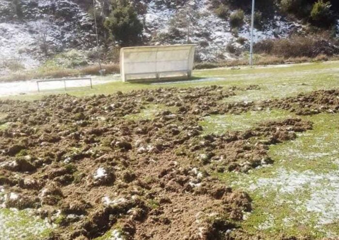 Όπως μαρτυρούν οι φωτογραφίες που δόθηκαν στη δημοσιότητα, ένα κοπάδι από αγριογούρουνα εισήλθε στον αγωνιστικό χώρο, οργώνοντας κυριοέκτικά το γήπεδο και προκαλώντας σοβαρές ζημιές.