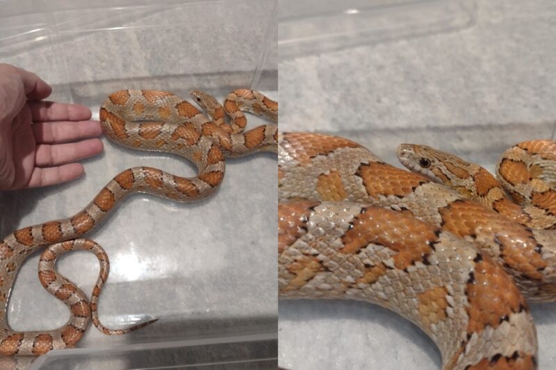 Όπως επισημαίνει η Herpetofauna, πρόκειται για Corn Snake, είδος πολύ συνηθισμένο στο εμπόριο κατοικίδιων ζώων και πιθανότατα ξέφυγε από γυάλα κοντινού σπιτιού.