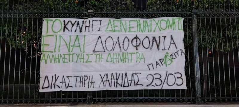 Υ.Σ. Στη φωτό, πανό που ανάρτησαν οι “σύντροφοι” βίγκαν, αντισπισιστές για την κατηγορούμενη.