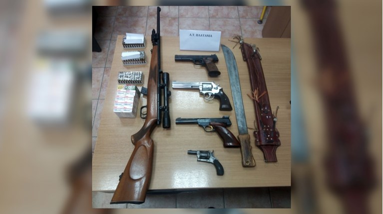 Πιο συγκεκριμένα, οι αστυνομικοί κατάσχεσαν ένα πολεμικό τυφέκιο με τη γεμιστήρα του, με ενσωματωμένη διόπτρα και μηχανισμό λέιζερ, δύο πιστόλια με τους γεμιστήρες τους, δύο περίστροφα, μία ματσέτα και 646 σφαίρες.
