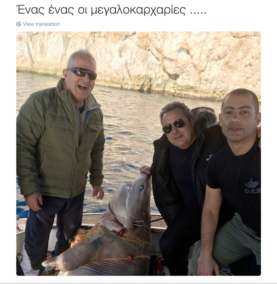 «Σε μήνυμα στον προσωπικό του λογαριασμό στο twitter, ο Υπουργός Εθνικής Άμυνας Πάνος Καμμένος κάνει λογοπαίγνιο με σκοτωμένο «μεγαλοκαρχαρία» που κρατάει επιδεικτικά από το στόμα. Στο συγκεκριμένο τουίτ, ο υπουργός γράφει «Ένας ένας οι μεγαλοκαρχαρίες…”